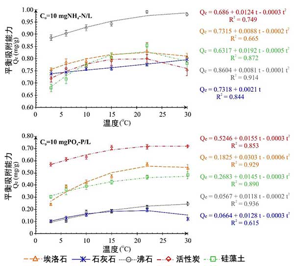 銨和磷酸根離子的平衡試驗僅在3℃至22℃的溫度范圍內進行,因此,吸附容量和溫度的關系沒有用多項式函數描述。類似地,如在系列I的分析中,活性炭對除去銨離子效果比較好,在磷酸鹽的情況下,具有高去除能力的材料是活性炭。