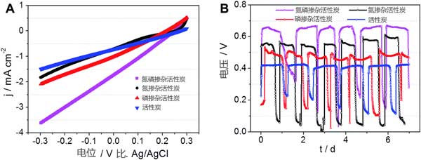 不同摻雜比的活性炭催化劑在微生物燃料電池中的實際性能,各種氧化還原催化劑的空氣陰極。線性掃描伏安法曲線由圖3A表明,所有的空氣陰極具有摻雜碳改性的活性炭催化劑表現(xiàn)出比原始活性炭催化劑的更高電流響應(yīng)。與氮摻雜和磷摻雜相比,氮磷共同摻雜的活性炭顯示高電流密度。如圖3B所示,使用雙摻雜的活性炭催化劑的空氣陰極燃料電池能夠在1000Ω的外部電阻上產(chǎn)生0.668V的穩(wěn)定電壓,這遠高于本期制造的其它催化劑。這些結(jié)果意味著摻雜碳的改性是增強活性炭的氧化還原活性的可靠方法。此外,當(dāng)在微生物燃料電池的空氣陰極中用作氧化還原時,由氮和磷共摻雜碳改性制備的活性炭優(yōu)于氮磷單獨摻雜改性的活性炭。