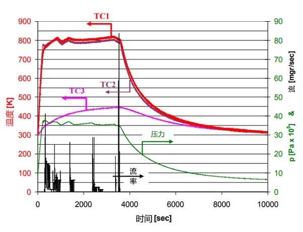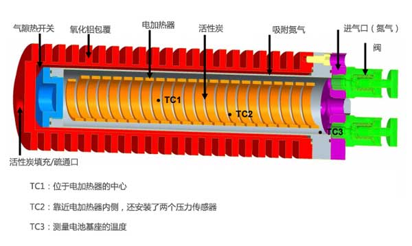 排出壓力約為3.5MPa的實驗結果如圖4所示。250秒后,加熱功率為500W,中心溫度超過476℃,而電池底座溫度則為76℃。然而,將電池達到其穩(wěn)態(tài)溫度分布需要大約60分鐘,其中電池基座中的溫度為166℃;钚蕴康臏囟炔辉试S超過526℃。 60分鐘,加熱功率逐漸降低,以保持最高溫度低于526℃,壓力高于3.5MPa。由于電池基座的溫升速率隨時間降低,輸送的氮量也減少了。因此,在15分鐘后結束放電階段僅從活性炭吸附池釋放4.6g氮。圖4中的冷卻階段持續(xù)約100分鐘,并且如果放電階段在15分鐘后結束(此時基礎溫度僅為126℃),則可以減少冷卻階段;钚蕴恐械募訜岷屠鋮s速率以及溫度分布與數(shù)值分析估計的相似。這表明簡化的數(shù)值傳熱分析為吸附池中的傳熱提供了令人滿意的估計。