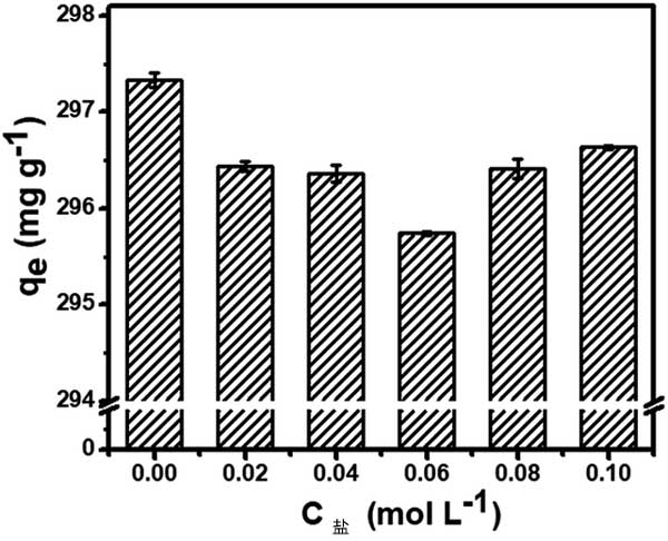 染料廢水含有各種鹽類和金屬離子,影響活性炭的吸附效率。在圖2中可以觀察到孔雀石綠對(duì)活性炭的吸附能力受鹽濃度的顯著影響。當(dāng)NaCl濃度為0.02mol L-1時(shí),吸附容量意外降低。然而,在將鹽濃度增加到0.10mol L-1的同時(shí),這種負(fù)面影響將變得可以忽略不計(jì)。如上所述,靜電相互作用可能在吸附過(guò)程中起關(guān)鍵作用。