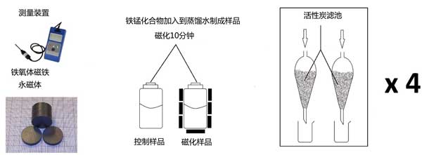 該實(shí)驗(yàn)在實(shí)驗(yàn)室規(guī)模上進(jìn)行,其中研究由八個分離漏斗組成。將各個分離漏斗成對分組并填充相同量的活性炭和其它吸附劑的過濾床。在每對分離漏斗中,一個用于對照樣品(不含磁性),而另一個用于磁化樣品。對照和磁化樣品分離漏斗中各個過濾材料的重量一樣。將鐵錳化合物加入到蒸餾水濃縮制備實(shí)驗(yàn)用的水溶液。對于磁化過程,使用永磁鐵氧體磁鐵進(jìn)行磁化。然后通過填充有活性炭和其它吸附劑的沉積物過濾溶液。未校正樣品的pH。pH的差異與添加單獨(dú)的金屬標(biāo)準(zhǔn)溶液有關(guān)。圖1顯示了制備用于過濾和過濾過程的模型水樣品的過程。