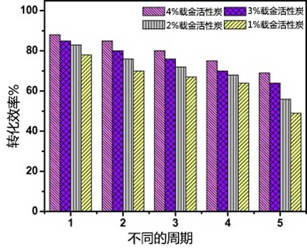為了量化活性炭載金催化劑的催化活性,可以使用轉換頻率作為度量。轉換頻率可以定義為使用每克活性炭每單位時間轉化成產(chǎn)物(對氨基苯酚)的反應物分子(對硝基苯酚)的數(shù)量;钚蕴枯d金催化劑是可回收的,每次運行后,通過離心分離催化劑。即使使用5次,催化劑的轉化率最多降10%。這通過繪制百分比轉換效率與循環(huán)次數(shù)來顯示,如圖3示。