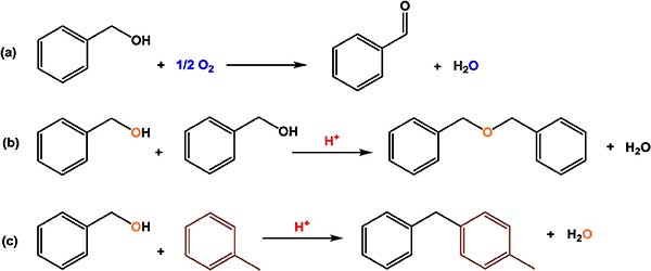 圖1所示,對(duì)于我們的銠活性炭催化劑,如果在布朗斯臺(tái)德酸中心存在下,芐醇氧化成苯甲醛可能發(fā)生平行反應(yīng):(a)苯甲醇氧化成苯甲醛(不需要酸中心)和副產(chǎn)物形成水。(b)兩分子芐醇縮合形成一分子二芐基醚,并除去水分子。(c)芐基化反應(yīng),包括從芐醇向甲苯分子中加入芐基碳陽離子(未顯示),并除去水分子以形成甲基-二苯基甲烷異構(gòu)體等。
