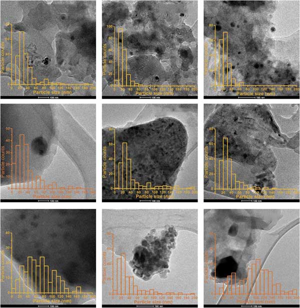 粒徑的變化在許多催化應(yīng)用中是至關(guān)重要的,并且使用硝酸的原理正是為了誘導(dǎo)這些變化。為了通過實(shí)驗(yàn)驗(yàn)證該假設(shè),對(duì)于所有九種載銠活性炭催化劑,通過TEM系統(tǒng)地評(píng)估Rh納米顆粒的粒度和分布。