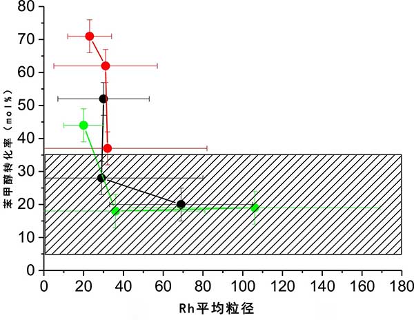 圖3:所有載銠活性炭的總轉(zhuǎn)化率與平均銠粒徑