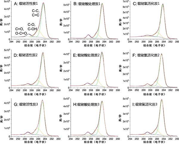 在我們的案例中,我們對(duì)所有9種活性炭催化劑進(jìn)行了詳細(xì)的X射線光電子能譜分析。但是,我們應(yīng)該注意到,就表面原子組成而言,沒有檢測(cè)到信號(hào)。我們將此結(jié)果歸因于銠的固有低信號(hào),并且我們的銠中心極其分散在我們的碳基質(zhì)中,反過來非常低的暴露金屬部分用于有意義的檢測(cè),X射線粉末衍射儀分析也證實(shí)了這一點(diǎn)。