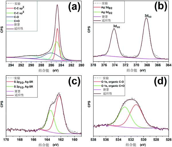 圖2顯示了所制備的活性炭樣品的組成元素的XPS光譜。XPS測量圖顯示碳,銀,硫和氧作為構(gòu)成元素的存在。S 1p光譜配有多個高斯分量,這些物種通常存在于活性炭表面上。圖2(b)分別顯示了多個峰,它們與零價態(tài)的銀原子一致。S 2p光譜的高分辨率光譜的反卷積,如圖2(c)所示,顯示兩個自旋軌道分裂為〜1.2 eV的峰。O 1s光譜顯示出不對稱的曲線,表明活性炭表面存在多種氧物質(zhì)(圖2d)。光譜的反卷積產(chǎn)生兩個,其可分別歸因于活性炭表面的C-O和C O物質(zhì),因此不存在金屬氧化物物質(zhì)。總之,XPS結(jié)果表明硫醇鹽配體保持附著在銀簇表面的表面上,并且在活性炭樣品中不發(fā)生銀原子的氧化。