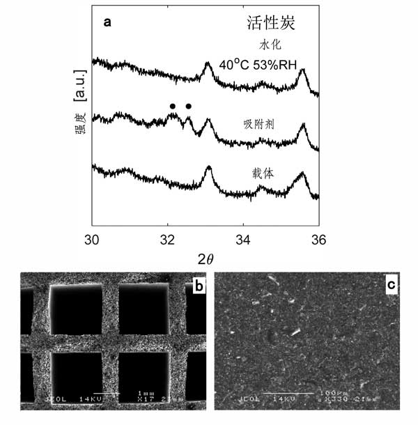 圖1a顯示了在40℃和相對濕度為53%下水合處理后活性炭載體,吸附劑和活性炭X射線衍射圖。由于碳酸鉀倍半水合物的反射特性的存在證實了鹽在載體上的負載。由于載體中加載的鹽量低,解釋了這些反射的低強度,5.58wt%。其余的峰對應(yīng)于載體中的不同相,例如碳和二氧化硅。圖1b顯示了活性炭載體的SEM照片。如圖中所看到的圖中,信道是正方形幾何形狀的具有每邊1.979±0.006毫米的長度,并且所述通道之間的壁的厚度是0.651±0.022毫米。圖1c示出了通道的內(nèi)壁的表面上,他們看起來很同質(zhì)。