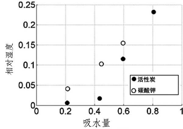 根據(jù)以前的測試結(jié)果,當(dāng)相對濕度在6至10%的范圍內(nèi)并且其在40%以上潮解時,碳酸鉀在25℃開始水合。如圖2所示活性炭載體和吸附劑在40℃下的水吸附容量;钚蕴枯d體的吸收在相對濕度為60%下急劇增加,在相對濕度為80%下達到最大23%的重量增加。在那里,吸附劑的吸收量幾乎是載體的6倍,并且最重要的是,它遠遠高于理論上形成碳酸鉀倍半水合物所需的量。這種顯著差異的原因是鹽在約相對濕度為43%下潮解,因此所有過量的水在載體材料的孔中冷凝,產(chǎn)生鹽的水溶液。