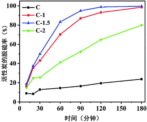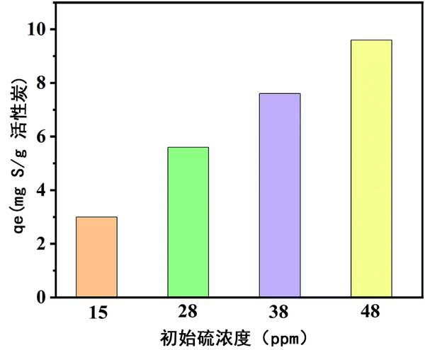 基于以上結(jié)構(gòu)表征和實(shí)驗(yàn)結(jié)果,得出了吸附機(jī)理。戊硫醇分子中的強(qiáng)路易斯酸S原子與活性炭中來自氧原子的一對(duì)電子相互作用。大孔和中孔的存在有助于活性炭的比表面積增加,暴露出更多的內(nèi)部原子,并促進(jìn)了質(zhì)量傳遞,從而使吸附劑易于與硫化物接觸。關(guān)于炭1.5的工業(yè)應(yīng)用前景,考慮了硫的初始濃度對(duì)吸附性能的影響。如圖3所示,對(duì)于初始含硫量分別為15、28、38和48 ppm的模型燃料,炭1.5的平衡吸附容量為每克吸附劑3.0、5.6、7.6和9.6 mgS。值得注意的是,在此濃度范圍內(nèi),吸附劑的硫去除率高于97%。這組結(jié)果表明該材料對(duì)于去除低濃度的硫化物具有明顯的工業(yè)應(yīng)用價(jià)值。