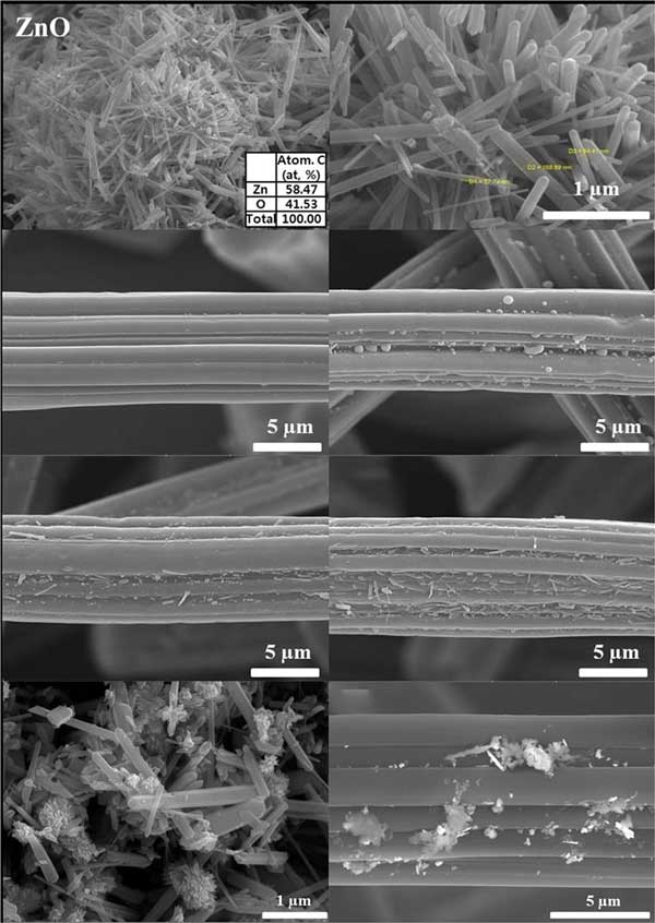 圖1顯示了ZnO顆粒和ZnO負(fù)載的活性炭纖維表面形態(tài)隨ZnO濃度變化的SEM圖像。形成花狀的ZnO結(jié)構(gòu),并且ZnO顆粒的直徑為50〜170 nm。根據(jù)EDS分析,ZnO顆粒中的Zn和O含量分別為58.47%和41.53%。在制備ZnA樣品期間,ZnO顆粒分散在纖維表面上。另外,在低濃度下,ZnO顆粒的形狀不利于生長(zhǎng),并且抑制了活性炭生長(zhǎng)為六方柱形狀的能力。SEM圖如圖1所示。CuO和ZnO顆粒在樣品中聚集,并且這些聚集物分散在樣品的纖維表面上。SEM圖像表明,一些活性炭的孔被CuO和ZnO顆粒阻塞。