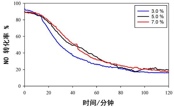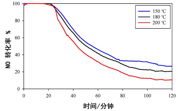 使用活性炭載錳氧化物催化劑時(shí),不同溫度下NO轉(zhuǎn)化率數(shù)據(jù)與時(shí)間的關(guān)系如圖2所示。它用于提供可以與以前發(fā)布的數(shù)據(jù)進(jìn)行比較的基線(xiàn)數(shù)據(jù)。在所有溫度(150°C,180°C和200°C)的前20分鐘內(nèi),幾乎有100%的NO轉(zhuǎn)化發(fā)生,但在此初始階段后NO轉(zhuǎn)化迅速下降,并且在2小時(shí)的測(cè)試后,轉(zhuǎn)化率不足20%。活性的溫度依從性依次為150°C>180°C>200°C。
