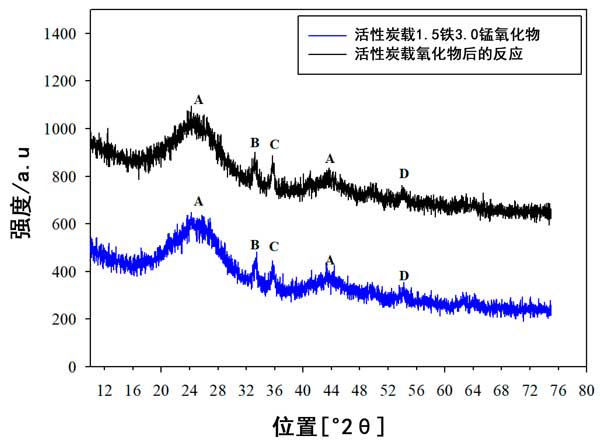 來(lái)自活性炭載鐵錳氧化物的XRD數(shù)據(jù)顯示在圖5中,其中已鑒定出主要峰。在2θ=24°和2θ=43°處的寬峰(標(biāo)記為A)與無(wú)定形碳的峰一致。它們的位置和寬度在新鮮和經(jīng)過(guò)測(cè)試的催化劑中都相同,這表明活性炭無(wú)定形結(jié)構(gòu)的穩(wěn)定性。在新鮮催化劑和測(cè)試催化劑中,在2θ=33.5°,2θ=35.1°和2θ=54.3°處分別出現(xiàn)了另外三個(gè)峰(分別標(biāo)記為B,C和D),并且位置或峰強(qiáng)度沒(méi)有明顯變化作為反應(yīng)測(cè)試的結(jié)果。2θ=33.5°(峰標(biāo)記為B)處的峰歸因于Fe 2 O 3 和在2θ=35.1°和54.3°的峰歸因于Fe 3 Mn 3 O 8,盡管在新鮮和測(cè)試的催化劑中這些與鐵有關(guān)的峰的強(qiáng)度和寬度相同,但是由于XRD峰較弱,因此很難確定在測(cè)試過(guò)程中鐵和錳的結(jié)晶度是否發(fā)生了變化。然而,結(jié)合的鐵氧化物與錳氧化物確實(shí)原因形成Fe 3的Mn 3 ö 8固體溶液,其可在的活性炭載鐵錳氧化物催化劑的NO轉(zhuǎn)化。