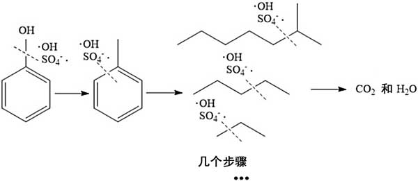 圖4顯示了苯酚的降解過程。首先破壞連接苯酚中羥基的化學鍵,然后打開苯環(huán)以形成通過單鍵連接的單鏈。隨著反應(yīng)的進行,單鏈之間的化學鍵被破壞,并形成具有較少碳原子數(shù)的單鏈。將鏈重組為新的長鏈的過程是由于氧化劑劑量不足。然而,隨著反應(yīng)的進行,諸如這些短鏈和新形成的長鏈的中間體被進一步降解。在此過程中,一些單鏈會隨著反應(yīng)時間的增加而重組形成一條更長的新單鏈。隨著這一過程的繼續(xù),長單鏈逐漸分解成短鏈,然后苯酚礦化成二氧化碳和水。