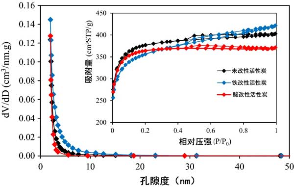表面積和孔徑?jīng)Q定了吸附劑的吸附性能。活性炭具有大量的內(nèi)部孔,具有較大的比表面積。HNO 3和Fe 對改性活性炭的BET表面積,BJH平均孔徑和孔體積均有不同程度的變化。在常溫條件下,濃HNO 3在活性炭表面溶解了一定的灰分,有助于進一步擴大多孔結(jié)構(gòu)。但是,濃HNO 3還腐蝕了活性炭的結(jié)構(gòu),從而部分破壞了內(nèi)部通道結(jié)構(gòu)并降低了活性炭的比表面積。至于鐵改性的活性炭,內(nèi)表面的鐵材料層堵塞了某些通道,從而降低了比表面積,平均孔徑和孔體積。