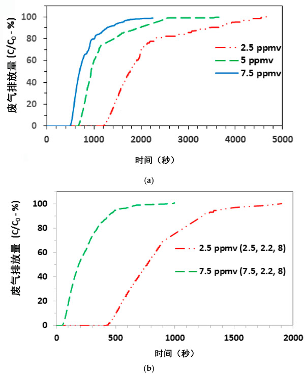 我們進(jìn)行了一組實(shí)驗(yàn)以評估進(jìn)水氨濃度對其基于吸附的去除的影響。為此,使用6 cm和8 cm的活性炭色譜柱,在不同的進(jìn)水氣態(tài)氨濃度下進(jìn)行了幾次實(shí)驗(yàn)。對于8 cm活性炭色譜柱,初始實(shí)驗(yàn)在2.5至7.5 ppmv的氣態(tài)氨氣之間進(jìn)行。分別在1.1和2.2 L/min的氣體流速下的各自發(fā)現(xiàn)顯示在圖2a,b中。顯然,隨著進(jìn)水氨濃度的逐漸降低,突破點(diǎn)也向更長的時(shí)間轉(zhuǎn)移。例如,圖2中的結(jié)果a顯示以下突破趨勢:1295分鐘(2.5 ppmv)>712分鐘(5 ppmv)>532分鐘(7.5 ppmv)。此外,各個(gè)實(shí)驗(yàn)的排氣時(shí)間值還顯示出在較低氣態(tài)氨濃度下的較長運(yùn)行時(shí)間,即4000分鐘(2.5 ppmv)>2312分鐘(5 ppmv)>1574分鐘(7.5 ppmv)。此外,圖2中的吸附趨勢通常顯示出較寬的吸附穿透曲線,表明傳質(zhì)區(qū)(MTZ)的長度相對較大。這與苯在活性炭上的吸附有所不同,后者表現(xiàn)出明顯的穿透曲線。對于氨而言,這種不同的趨勢可能歸因于可以與表面酸性基團(tuán)相互作用的氨部分的基本性質(zhì)。進(jìn)入的氣態(tài)氨的增加及其從整體氣相到GAC表面的轉(zhuǎn)移將啟動GAC表面吸附位點(diǎn)(包括孔中的那些位點(diǎn))更快的消耗。由于各自的表面吸附位點(diǎn)是固定的和有限的,因此預(yù)計(jì)在較高的進(jìn)水氨濃度下,較早的突破以及較早的耗盡將逐漸發(fā)生。