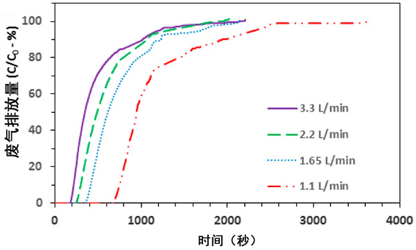 本研究還使用基于數(shù)據(jù)坑的活性炭研究了氣體流速對氨吸附的影響。圖3提供了1.1至3.3 L/min的氣體流速的相應(yīng)結(jié)果。通常,氨氣流量的逐漸增加也會導(dǎo)致相應(yīng)的穿透時(shí)間和排氣時(shí)間響應(yīng)逐漸減少(圖3)。例如,流量為1.1、1.65、2.2和3.3 L/min時(shí)的突破時(shí)間分別為712、383、272和197 min(圖3)。因此,較高的突破時(shí)間值在較低的氨氣流速下蒸發(fā)。此外,對于1.1、1.65、2.2和3.3 L/min流量研究,還分別記錄了2312、1673、1315和1213分鐘的排氣時(shí)間。這類似于上述突破時(shí)間趨勢,可以解釋如下。在較低的流入氣體流速下,氨分子從氣相到活性炭表面的傳質(zhì)速率也相對較小。因此,與較高氣體流速下的活性炭表面部位相比,單位時(shí)間內(nèi)所占據(jù)的活性炭表面部位也更少,產(chǎn)生更高的穿透時(shí)間和耗竭時(shí)間響應(yīng)(圖3)。這些發(fā)現(xiàn)對于實(shí)際應(yīng)用尤其重要。