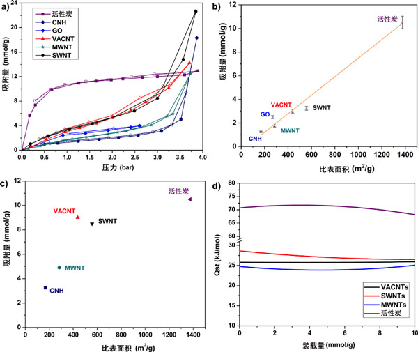 兩種吸附劑在25°C下的二氧化硫吸附等溫線如圖3a所示。活性炭的吸附容量可歸因于微孔的存在。如圖分析所示,微孔占活性炭的總可用表面積的幾乎89.5%。在1bar時,碳納米角的二氧化硫攝入量最低,其次是碳納米管和氧化石墨烯。在圖3b中,繪制了在1bar下SO 2的吸附量與吸附劑的BET比表面積的函數(shù)關(guān)系。在1 bar時,BET比表面積和SO 2吸附之間幾乎存在線性關(guān)系。在相對壓力P/P 0小于0.3的近環(huán)境條件下,發(fā)現(xiàn)氧官能團(tuán)的影響更為明顯。在我們對單壁碳納米管的TEM測量中,我們看到了少量的多壁碳納米管和其他催化劑雜質(zhì)的存在。這些異物的存在可能是SWNT中觀察到的SO 2吸收率低的原因之一。
