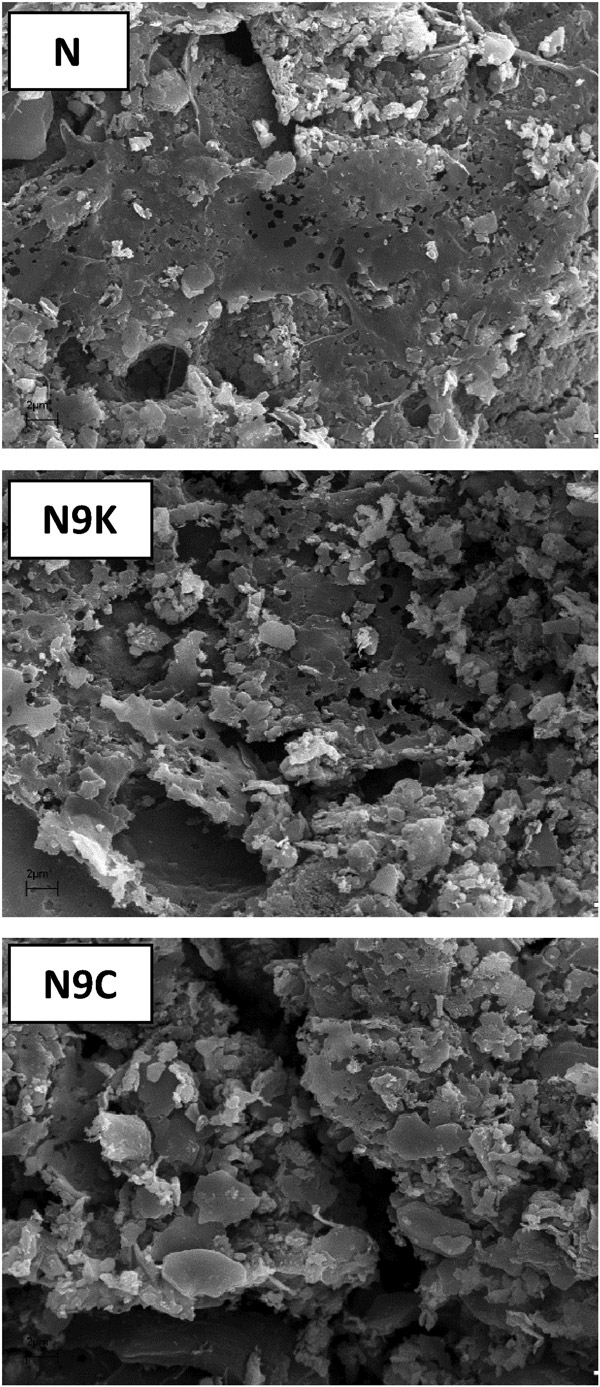 活性炭和經(jīng)改性后獲得的樣品的化學(xué)成分。兩種修飾均導(dǎo)致灰分含量以及結(jié)構(gòu)中特定元素的變化,其中這些變化對N9K樣品而言更大。起始活性炭(N)暴露于碳酸鉀會導(dǎo)致礦物質(zhì)(灰分)的顯著下降,同時氫含量下降兩倍(可能是碳結(jié)構(gòu)芳構(gòu)化的結(jié)果)由于活性炭顆粒的表面氧化,增加了氧氣量。還值得注意的是,灰分含量比在CO 2中退火的N9C樣品低了近10倍。大氣層。N9K中的灰分很可能是由于活化后將其用5%的鹽酸溶液洗滌而導(dǎo)致的。圖1所示的SEM圖像也證實(shí)了各個活性炭的質(zhì)地和形態(tài)多樣性?梢钥闯,根據(jù)制備程序,樣品在尺寸,形狀以及孔的數(shù)量或排列方面存在顯著差異。特別是在活性炭和N9C樣品中可以觀察到的較亮片段可能是其結(jié)構(gòu)中存在灰分(礦物質(zhì))的結(jié)果。