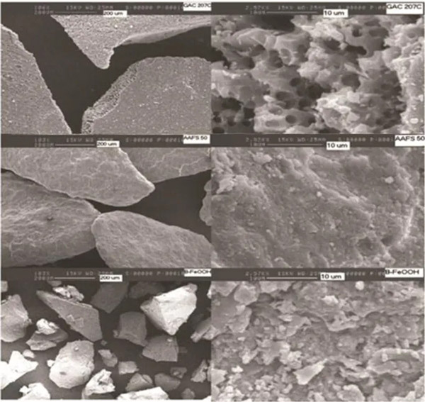 圖2顯示了吸附劑的SEM圖像;钚蕴烤Я5乃毫堰吘壱诧@示出內(nèi)部“孔”。其內(nèi)部結(jié)構(gòu)可以被認為是碳板的石墨型分層。活化過程中產(chǎn)生的孔隙和大量碎屑導致了這種吸附劑的易碎性。AAFS晶粒顯示出相同的傾斜形狀,表面看起來光滑且具有均勻的涂層。在更大的范圍內(nèi),僅可見很少的裂縫或孔洞,這表明表面積主要在外部。β-FeOOH的表面具有高脆性,因此表面光滑且?guī)в写罅克樾。多孔結(jié)構(gòu)與SEM照片非常吻合(圖2),說明了活性炭的片狀結(jié)構(gòu)及其眾多的空洞,而鐵化合物則顯得光滑,只有很少的裂紋;罨^程中產(chǎn)生的孔隙和大量碎屑導致了這種吸附劑的易碎性?紤]規(guī)模,中孔和大孔上看到照片(尺寸以上2.5 μ M)。β-FeOOH的表面易碎,因此表面光滑,帶有大量碎屑。該刻度不允許人們區(qū)分赤霞石微晶(FeOOH的β形式)的特征桿雪茄形狀。