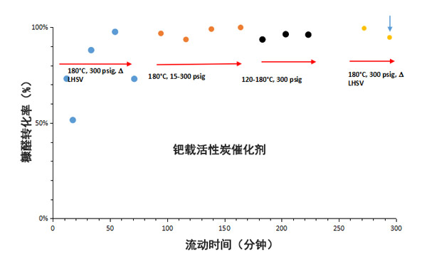 圖1:使用活性炭催化劑進(jìn)行糠醛加氫的生產(chǎn)時間分析,箭頭表示將乙酸添加到進(jìn)料中的實(shí)驗(yàn)。