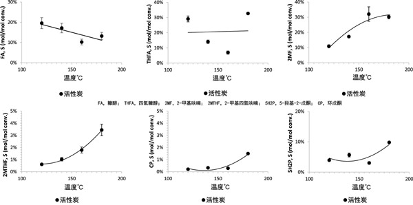 由于使用活性炭整料進(jìn)行糠醛連續(xù)氫化以合成糠醇,四氫糠醇和環(huán)戊酮的工作很少,我們希望確定溫度和壓力對選擇性和時空產(chǎn)率或轉(zhuǎn)化率的影響。因此,在一組實(shí)驗(yàn)中,采用活性炭催化劑來確定溫度對糠醛氫化的影響。在所有溫度下,活性炭整料的糠醛轉(zhuǎn)化率均高于90%;钚蕴空系母咛挤忾]率是在180°C時達(dá)到的(約90%)。升高溫度會降低糠醇的選擇性,并提高除四氫糠醇以外的所有產(chǎn)品的選擇性(圖2)。