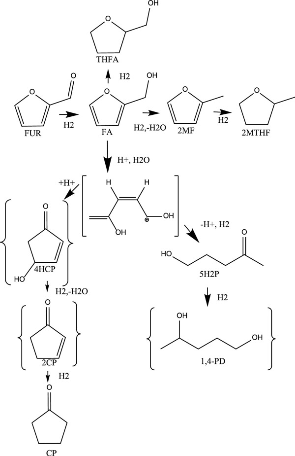 在下一組實(shí)驗(yàn)中,確定了液體停留時間對糠醛加氫超過0.8%活性炭催化劑的影響(H 2氣流保持恒定在100 mL/min)。糠醛轉(zhuǎn)化率隨著液時空速的增加或停留時間的縮短而下降,碳封閉率在74%至100%之間。溫度,壓力和液體停留時間效應(yīng)研究的結(jié)果表明,活性炭催化劑主要通過糠醛促進(jìn)了糠醛中糠醇和2-甲基呋喃的形成,并通過推測性反應(yīng)途徑促進(jìn)了環(huán)戊酮和5-羥基-2-戊酮的少量形成,需要對酮進(jìn)行酸催化)形成(圖3)。