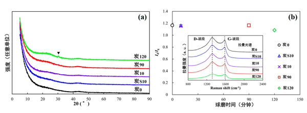 圖1:XRD圖案和研磨時(shí)間之間的關(guān)系和活性炭的值。(a)X射線衍射圖案,(b)拉曼光譜值。
