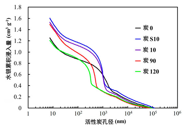 圖3:使用水銀壓入孔隙率法獲得的使用球磨活性炭的盤式EDLC電極的累積孔體積。
