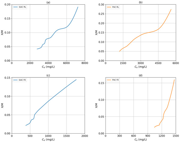 圖1顯示了顆;钚蕴颗c原浸出液,粉狀活性炭與原浸出液,粉狀活性炭與廢液以及粉狀活性炭與廢液的實驗等溫線。兩個樣品的曲線和兩個活性炭對應(yīng)于S形的等溫線(II型)的行為,因為曲線是凹向上,所以多層吸附進(jìn)行活性炭的表面上。利用該信息,就滲濾液而言,不管活性炭顆粒的性質(zhì)和大小如何,都可以假定吸附劑中殘留的化學(xué)需氧量是通過物理吸附發(fā)生的。