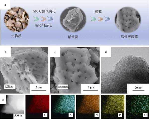 首先,除去生物質(zhì)的污垢和表面雜質(zhì),用清水徹底清洗活性炭原材料,然后用蒸餾水反復(fù)清洗,然后將它們粉碎成碎片,然后在烤箱中100°C下干燥。為了進(jìn)行預(yù)碳化,將干燥的生物質(zhì)在氮氣氛下的真空管式爐中在500°C的溫度下熱解2小時,以去除少量有機分子。隨后,為了通過化學(xué)活化提高比表面積,將預(yù)碳酸化的生物質(zhì)以1:4的重量比浸入作為化學(xué)活化劑的水溶液中,然后充分?jǐn)嚢?小時以確保完全滲透。之后,將混合物在N 2下于900°C退火1小時。最后,用鹽酸反復(fù)洗滌退火后的樣品,然后用過量的蒸餾水沖洗以獲得中性pH。最終樣品通過在80°C的空氣中干燥獲得,并標(biāo)記為多孔活性炭。相比之下,使用相同步驟制備的未添加活化劑的產(chǎn)品被標(biāo)記為無孔活性炭。接著使用這兩種活性炭升級成加硫復(fù)合材料,將升華后的硫(純度>99.95%)和相應(yīng)的活性炭粉末(重量比為60:40)充分混合并在研缽中研磨。然后,將獲得的混合物用特氟隆容器密封在高壓釜中。在155°C下熱處理12小時后,獲得了多孔摻硫活性炭和無孔摻硫活性炭復(fù)合材料。