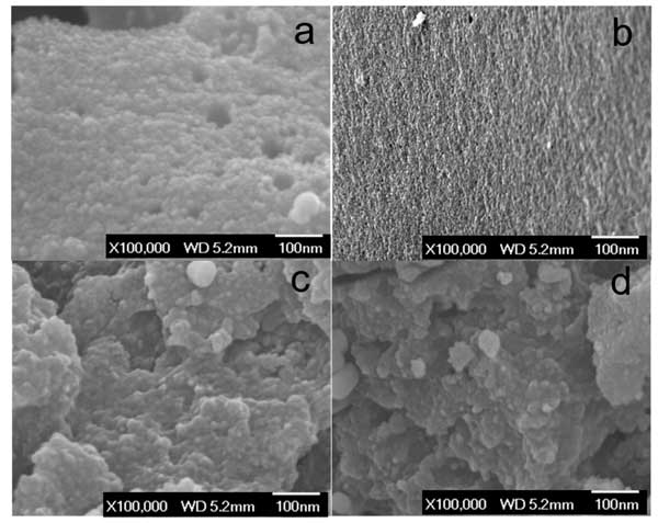 首先是電子顯微鏡,圖1顯示了活性炭(a),高溫活化后的活性炭(b),鎢浸漬活性炭(c)和鎢浸漬活性炭載鉑催化劑(d)的形態(tài)。SEM圖像(圖1a)顯示了在CO 2氣氛下在800℃下氣化的固體炭的形態(tài)。其多孔表面是由高溫下的CO 2蝕刻過程所貢獻(xiàn)的。高溫活化后的活性炭變得高度多孔,在1000°C碳化后,炭中形成了更多的孔和通道(圖2b)。鎢浸漬活性炭樣品中原始的活性炭結(jié)構(gòu)似乎消失了(圖1c),因?yàn)樵诟邷叵禄钚蕴亢脱趸u之間的碳熱還原反應(yīng)破壞了活性炭結(jié)構(gòu);钚蕴康谋诒砻媲度肓酥睆皆3到10 nm之間的納米粒子(圖1c),根據(jù)XRD結(jié)果,這意味著這些納米粒子應(yīng)為碳化鎢結(jié)構(gòu)。在鎢浸漬活性炭樣品中加入1.0%鉑后,表面形態(tài)無(wú)明顯變化(圖1d)。