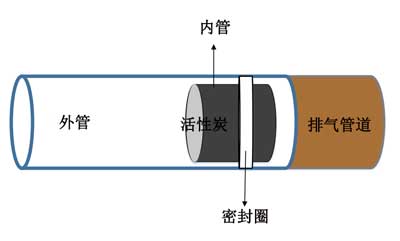 模擬的測試環(huán)境包含內(nèi)部和外部兩部分的試管進(jìn)行吸附。外管的長度為50cm,直徑為3.8cm。該管的功能是將排氣消聲器連接至氣體分析儀,而內(nèi)管則用作活性炭的儲存器。改變內(nèi)管的長度,以確定活性炭負(fù)載百分比對降低廢氣濃度的影響。直徑分別為3cm,4cm和5cm。管子之間有一個(gè)密封,以防止廢氣泄漏。管的結(jié)構(gòu)在圖1中進(jìn)行了描述。