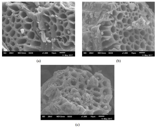 由氧化鎂改性的活性炭具有清晰且?guī)缀蹙鶆虻目捉Y(jié)構(gòu)。氧化鎂的存在會導(dǎo)致碳孔隙率降低,因此,由于活性炭的孔膨脹,孔之間的距離會更大。結(jié)果,產(chǎn)生的孔的數(shù)量將增加并且導(dǎo)致表面積增加。使用SEM對活性炭進(jìn)行表征,以觀察吸附劑的圖案或表面結(jié)構(gòu)。進(jìn)行了研究中的SEM表征,以確定使用由氧化鎂改性活性炭形成的孔隙條件。