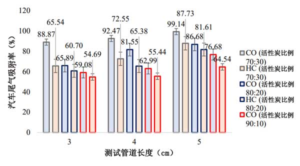 另外,隨著管的長度增加而增加,并導(dǎo)致活性炭的活性芯增加。吸附容量與活性炭的質(zhì)量成正比,因此可以吸收氣體的吸附劑分子也會增加。因此,吸附管中的長度變化對降低CO和HC濃度有影響。從圖3中可以看出,CO氣體的吸附百分比大于HC氣體的百分比。這是由于活性炭在CO和HC之間的吸附方式的變化。活性炭吸附模式受多種因素影響,包括活性炭分子在吸收污染物分子中的選擇性(親和力),溫度,壓力和氣體分子的大小。HC的分子結(jié)構(gòu)比CO更復(fù)雜。因此,HC的分子大小將比CO大。因此,活性炭吸附的HC小于活性炭吸附的CO。