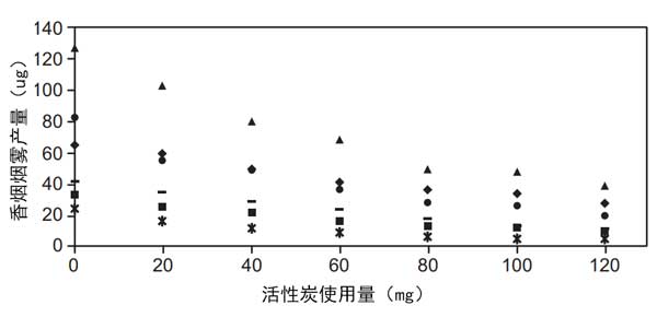 測(cè)試過程中我們?cè)跓o(wú)炭和以20毫克至120毫克的六種重量增量添加活性炭來(lái)測(cè)試香煙。桿端和嘴端的醋酸纖維素長(zhǎng)度段始終保持恒定。最大的空腔填充值用于所有負(fù)載,因此,總的過濾器長(zhǎng)度增加了約50%。每使用15毫克活性炭增加1毫米。如前所述,所有香煙都在35/2/60的條件下進(jìn)行調(diào)理和抽煙。每個(gè)濾嘴負(fù)載量高為120mg時(shí)添加活性炭對(duì)焦油和尼古丁的收率(即顆粒相)的影響很小,這可能是由于較長(zhǎng)的濾嘴導(dǎo)致了額外的機(jī)械過濾。對(duì)于所有測(cè)得的蒸氣,隨著活性炭載量的增加,產(chǎn)率都有所下降。這在圖1中以圖形方式顯示(僅出于清晰目的使用一定范圍的蒸氣),其中乙醛/丙酮值乘以0.1以進(jìn)行縮放。