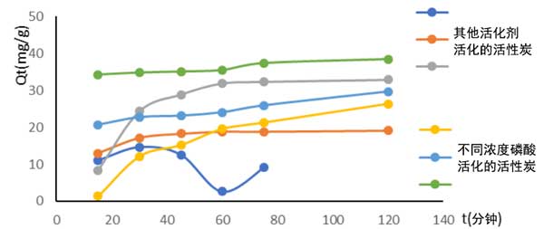 活性炭的吸附時間影響可從圖1看出,活性炭吸附分三步進行:第一是在最初的30分鐘內(nèi),污染物的吸附量很快就被確定了,這可以用在吸附劑的外表面存在大量空置的結(jié)合位點,這使得吸附劑易于吸附到該表面。第二在31分鐘后,吸附速率降低,過程緩慢;钚蕴康钠渌恢眠_到飽和后,污染物顆粒將遷移到吸附劑內(nèi)部。由于易于接近,因此吸附過程緩慢:顆粒內(nèi)擴散。第三從80分鐘開始,我們觀察到一次接觸,活性炭已達到其最大容量。我們可以說這些吸附劑的平衡時間是80分鐘。然而,磷酸活化的活性炭吸附量的演化曲線顯示,在最初的30分鐘內(nèi),污染物的吸附量顯著增加,此后,污染物的吸附量急劇下降,這將是一種產(chǎn)物解吸。這一現(xiàn)象在其他吸附劑中是不可見的,這可能意味著可用孔隙的數(shù)量和結(jié)合力隨著所用活化劑濃度的增加而增加,這一點還通過碘值和亞甲基藍的值進行了驗證。