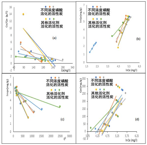 圖3:根據(jù)Langmuir(a),F(xiàn)reundlich,(b)條件D-R-K,(c)和Temkin,(D)苯二胺在活性炭上的吸附等溫線。