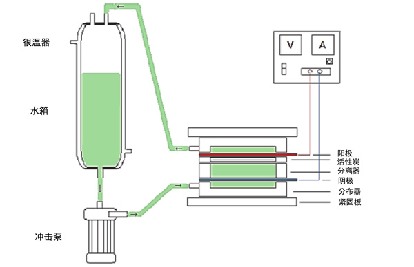 在這項研究中,已開發(fā)出用于溴化物電吸附的壓濾電化學電池。為了使電化學電池與受污染的水通過更寬的活性炭床接觸,已經對其進行了修改。在實驗過程中,水通過離心泵在陽極和陰極之間循環(huán),并通過發(fā)現(xiàn)為床的活性炭。這樣,可以獲得有關該間歇反應器中吸附動力學以及平衡吸附量的信息。最后的數(shù)據(jù)對于了解由于施加電勢而可能提高活性炭的吸附容量非常重要。圖1中顯示了電化學電池和用于電吸附過程的設備的示意圖。