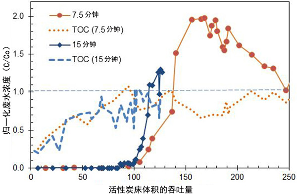 空床接觸時(shí)間對(duì)突破的影響說明如下:圖2用于123-三氯丙烷。盡管7.5分鐘和15分鐘EBCT的123-三氯丙烷突破的開始是相似的,但在100,000床體積之后,與7.5分鐘EBCT相比,15分鐘EBCT的突破更早。更長的EBCT容量降低可能是活性炭結(jié)垢的結(jié)果,這是由于更強(qiáng)的吸附力和不可置換的DOM到達(dá)吸附床的更深處,并超過了目標(biāo)有機(jī)物的吸附位點(diǎn)和/或覆蓋了活性炭顆粒的孔而導(dǎo)致的。時(shí)間并防止進(jìn)一步的目標(biāo)有機(jī)物吸附。通過比較相似突破點(diǎn)的吞吐能力差異,說明了EBCT對(duì)其他cVOC的活性炭性能的影響,其中負(fù)值表示在15分鐘EBCT時(shí)容量更大,正值表示在7.5分鐘EBCT時(shí)容量更大(或在15分鐘EBCT時(shí)容量較小)。床體積數(shù)量達(dá)到突破的10%,50%或75%的平均容量差異(不包括VC,因?yàn)槲丛u(píng)估15分鐘EBCT)分別為-0.1%,9%和13%,表明在運(yùn)行時(shí)容量沒有損失。15分鐘的EBCT突破了10%,突破了適度的容量,因?yàn)楦L的EBCT結(jié)垢了,因此突破了50%和75%。