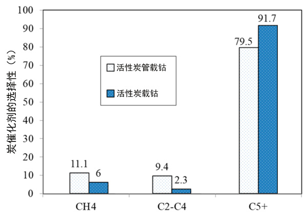 費托合成試驗是在210℃和2.5MPa的內(nèi)徑為12mm的不銹鋼固定床管式反應器中進行的。將0.5g催化劑與5.0g碳化硅稀釋劑的反應混合物裝入反應器中。催化劑在425℃下在N2中的33vol%H2中原位還原10小時。還原后,將反應器冷卻至180℃,并將H2/N2氣體混合物切換為合成氣(H2:CO為2∶1)。在合成氣加壓至2.5MPa然后在4小時內(nèi)重新加熱到210°C來完成反應。活性炭載鈷催化劑,活性炭納米管載鈷催化劑的CO轉(zhuǎn)化率分別為13.1%,6.7%。產(chǎn)物選擇性的結果在圖2中給出。與活性炭管樣品相比,活性炭產(chǎn)生更高的C5+和更低的CH4選擇性,這對氣體產(chǎn)物(C1-C4)也產(chǎn)生最高的選擇性。