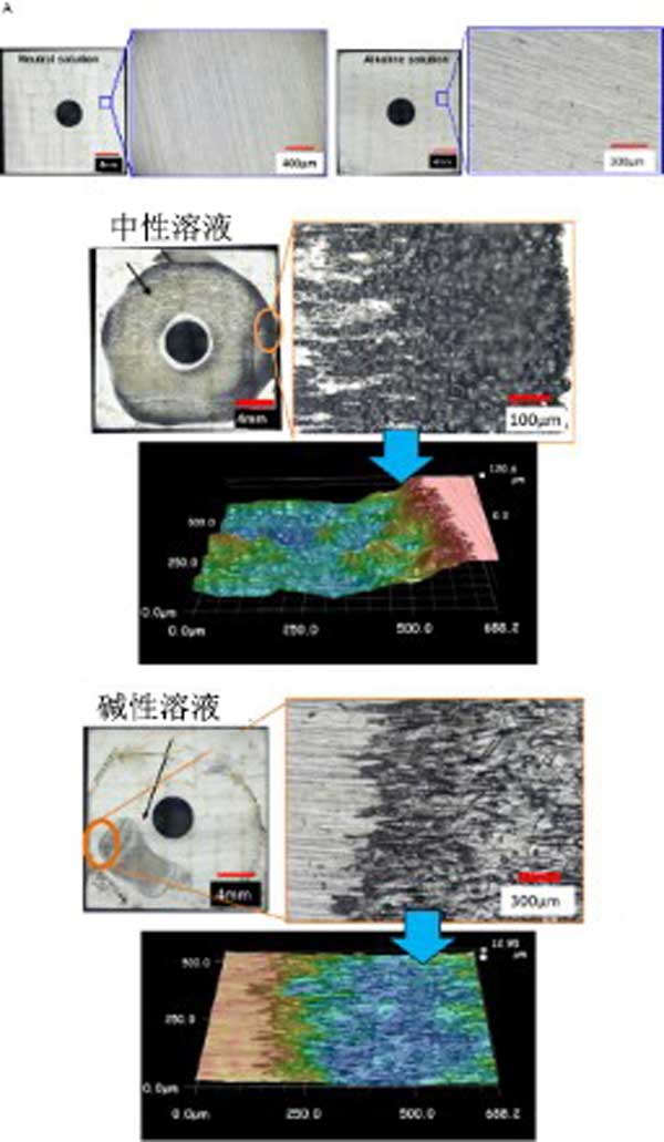 使用光學(xué)顯微鏡觀察實驗后樣品的表面形態(tài),如圖3所示。在中性和堿性溶液中未與活性炭接觸的樣品中未觀察到縫隙腐蝕。另一方面,在中性和堿性測試溶液中與活性炭接觸的樣品上發(fā)生縫隙腐蝕。這些結(jié)果清楚地表明,當(dāng)樣品與活性炭接觸時,縫隙腐蝕敏感性增加。在中性測試溶液的情況下,最大腐蝕深度為130μm并且縫隙腐蝕傳播以覆蓋樣品的幾乎所有褶皺區(qū)域。在堿性測試溶液的情況下,最大腐蝕深度為25μm并且腐蝕區(qū)域遠(yuǎn)小于中性溶液的情況。這些結(jié)果表明,在中性溶液的情況下腐蝕區(qū)域和深度更大,這表明在吸附塔中發(fā)生實際腐蝕。在堿性溶液的情況下腐蝕面積和深度較小的原因被認(rèn)為是Fe(OH)2的溶解速率的事實堿性溶液減少,這導(dǎo)致腐蝕速率降低;旧,在陽極部位的pH降低至去鈍化pH是縫隙腐蝕開始和傳播所必需的?紤]到這個方面,還可以解釋縫隙腐蝕行為的差異。
