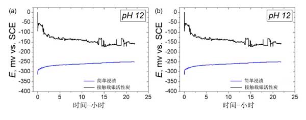 中性和堿性溶液中試樣的開路電位隨時間的變化如圖4所示。與銀浸漬活性炭接觸的樣品的開路電位在最初階段是高的,然后在中性和堿性溶液的實驗開始時急劇下降。根據(jù)這些結(jié)果,認(rèn)為在實驗開始時發(fā)生縫隙腐蝕,當(dāng)樣品與銀浸漬活性炭接觸時開路電位降低。結(jié)果表明“電化學(xué)效應(yīng)”是嚴(yán)重縫隙腐蝕的主要原因。